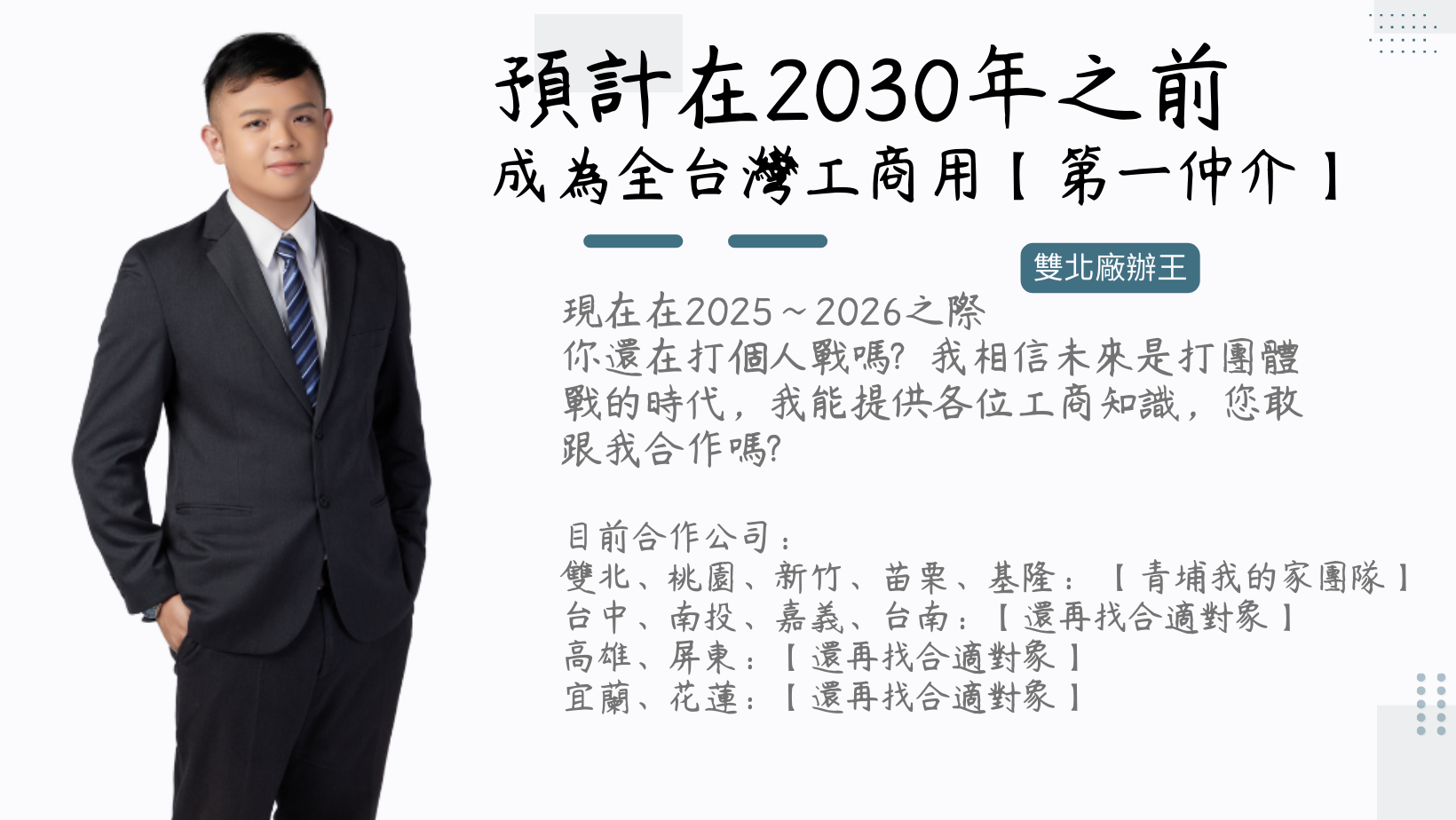 我預計在2030年底成為【全台灣第一專業指名工商仲介】