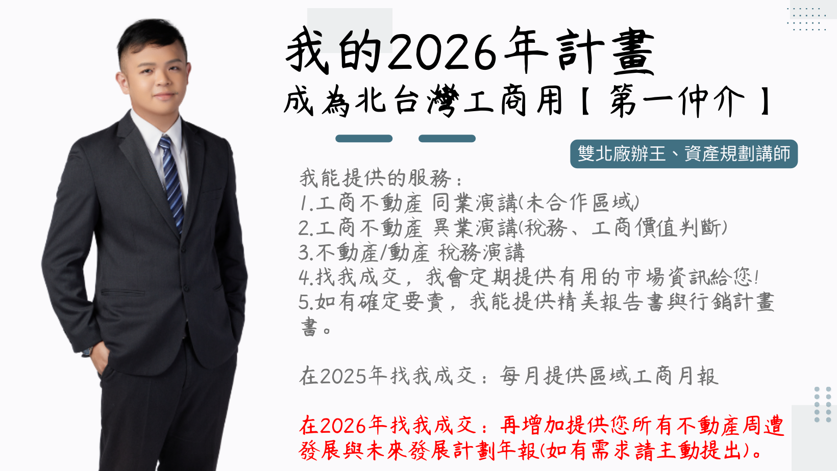 我預計在2026年底成為【北區第一專業指名工商仲介】