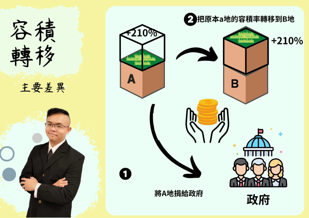 舉例來說,就是建商把A地捐給政府後,把原先捐出來的地支容積率轉移到B地,等於說B地的合法建築空間就變大了!