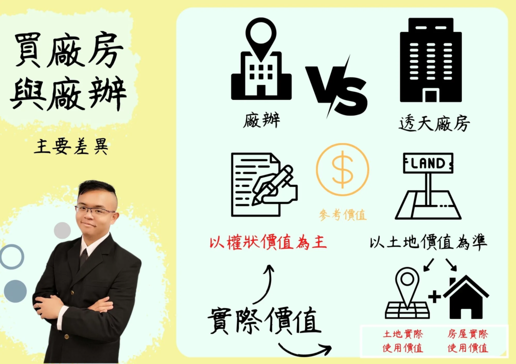 工廠分為兩種,分別是透天廠房與工業廠辦,這兩者差異主要是在價值計算上不同,而在購買房地產時會有兩張權狀,分別是【建物權狀】與【土地權狀】,而在大部分透天廠房的價值都是貴在【土地價值】、而工業廠房與住家都是貴在【建物價值】。