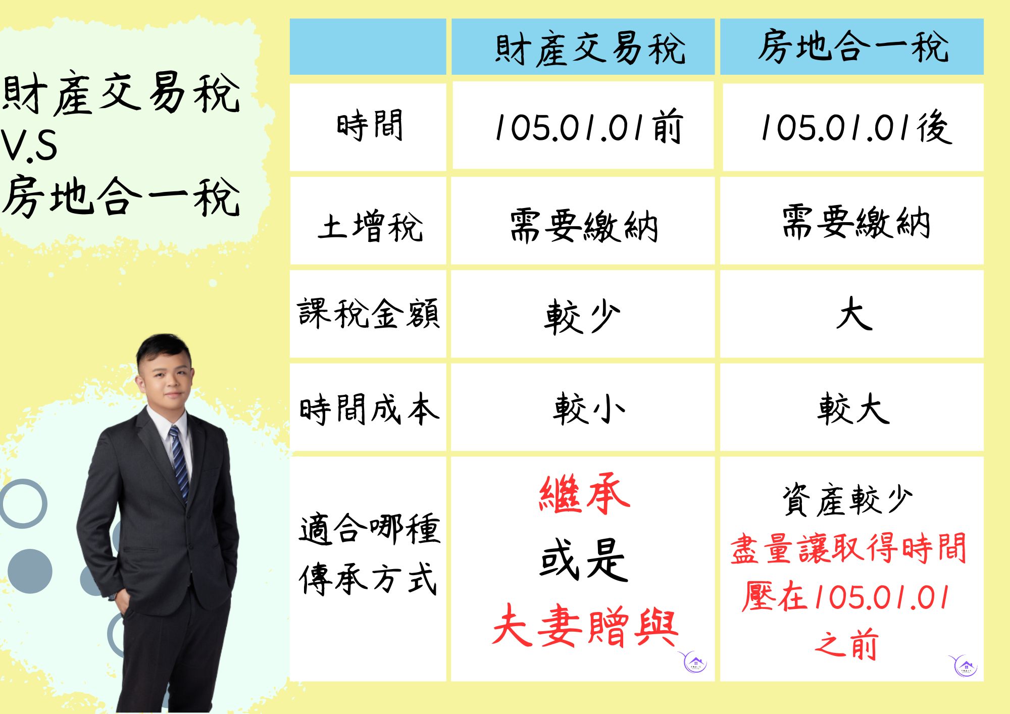 最後來介紹【繼承】,簡單來說小又統一建議客戶如果是105.01.01之前取得不動產,一慮使用【繼承】的方式來傳承不動產,最直接的方式就是之後出售時可以推定繼承人取得時間,等於說繼承後雖然謄本日期會壓在105.01.01之後,但是先人如果是105.01.01之前買的不動產,則可以選擇財產交易所得稅來繳納稅金,不過著邊要特別注意兩個部分: