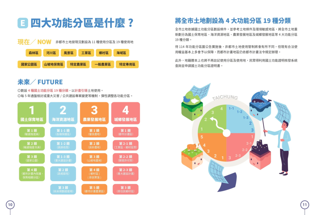 都市計畫區土地除具水資源保育、動植物保護性質的相關分區劃設為國土保育地區第 4類,具優良農地性質的農業區劃設為農業發展地區第 5 類外,其餘土地不論是住宅區、商業區或公共設施用地,一律都劃設為城鄉發展地區第 1 類,只代表這個區域仍依都市計畫規定管制,不代表就變為建地。 另不論劃設為城 1 或農 5,都市計畫農業區仍依都市計畫規定管制,不影響實際農地使用。而劃設為城 1,若未來有開發使用需求,可直接循都市計畫變更程序,無須辦理國土計畫變更,程序較為簡便,使用上較有彈性,不過農政資源補助上恐會受到影響。
