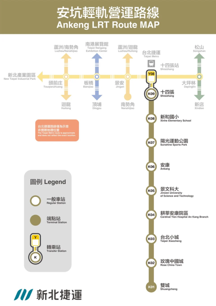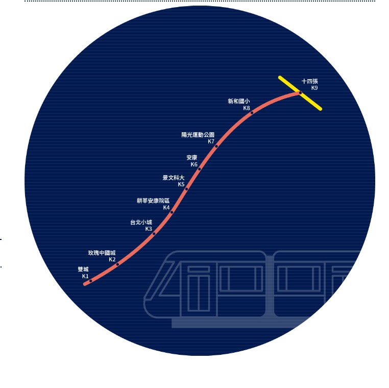 安坑輕軌由中和捷運環狀線中的十四張(K9站)接軌安坑輕軌,連接景文科大與耕莘醫院。