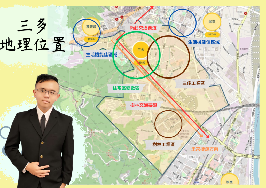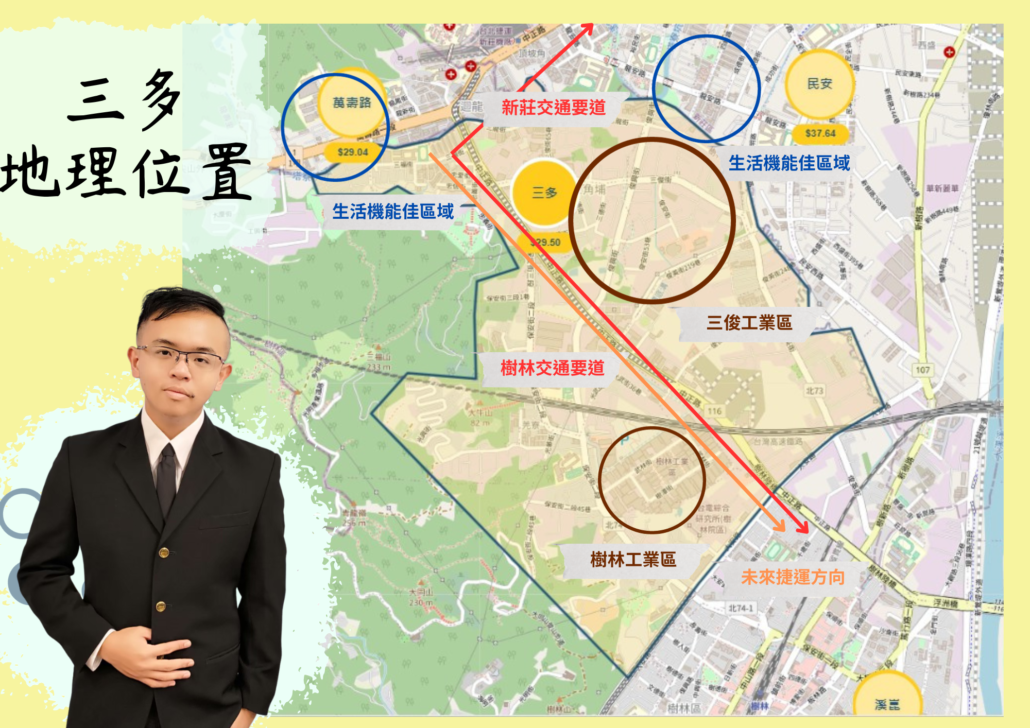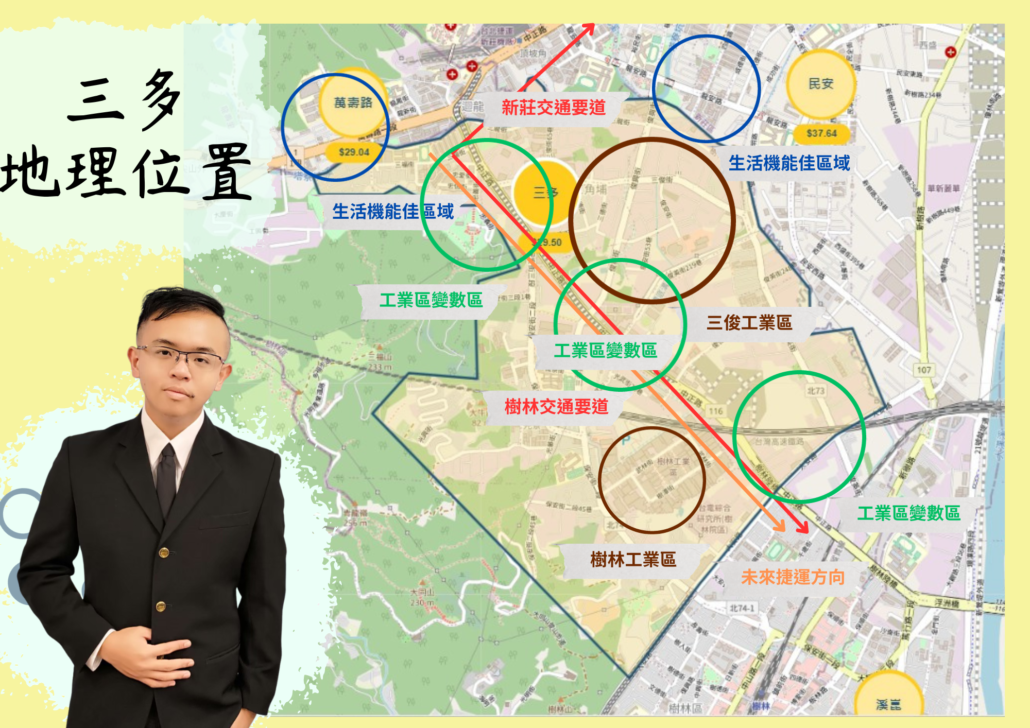 首先第一個介紹的是三多區域,這區域其實複雜度蠻高的,因為是樹林區最北且最鄰近新莊的區域,並且接軌桃園龜山,加上三多區域有兩個工業區分別是三俊工業區與樹林工業區,讓這區域處在工、住、商混和的狀態。