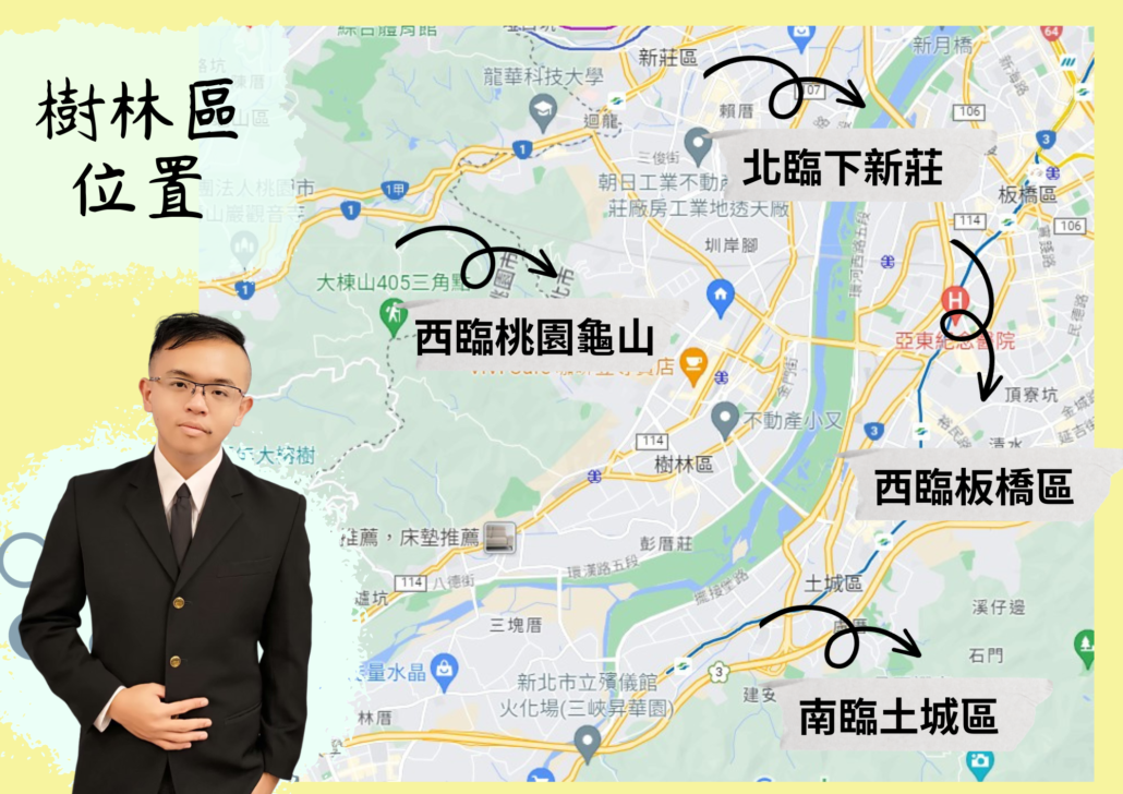 樹林區是北鄰下新莊、南臨土城區、東臨板橋區且西林桃園龜山區。