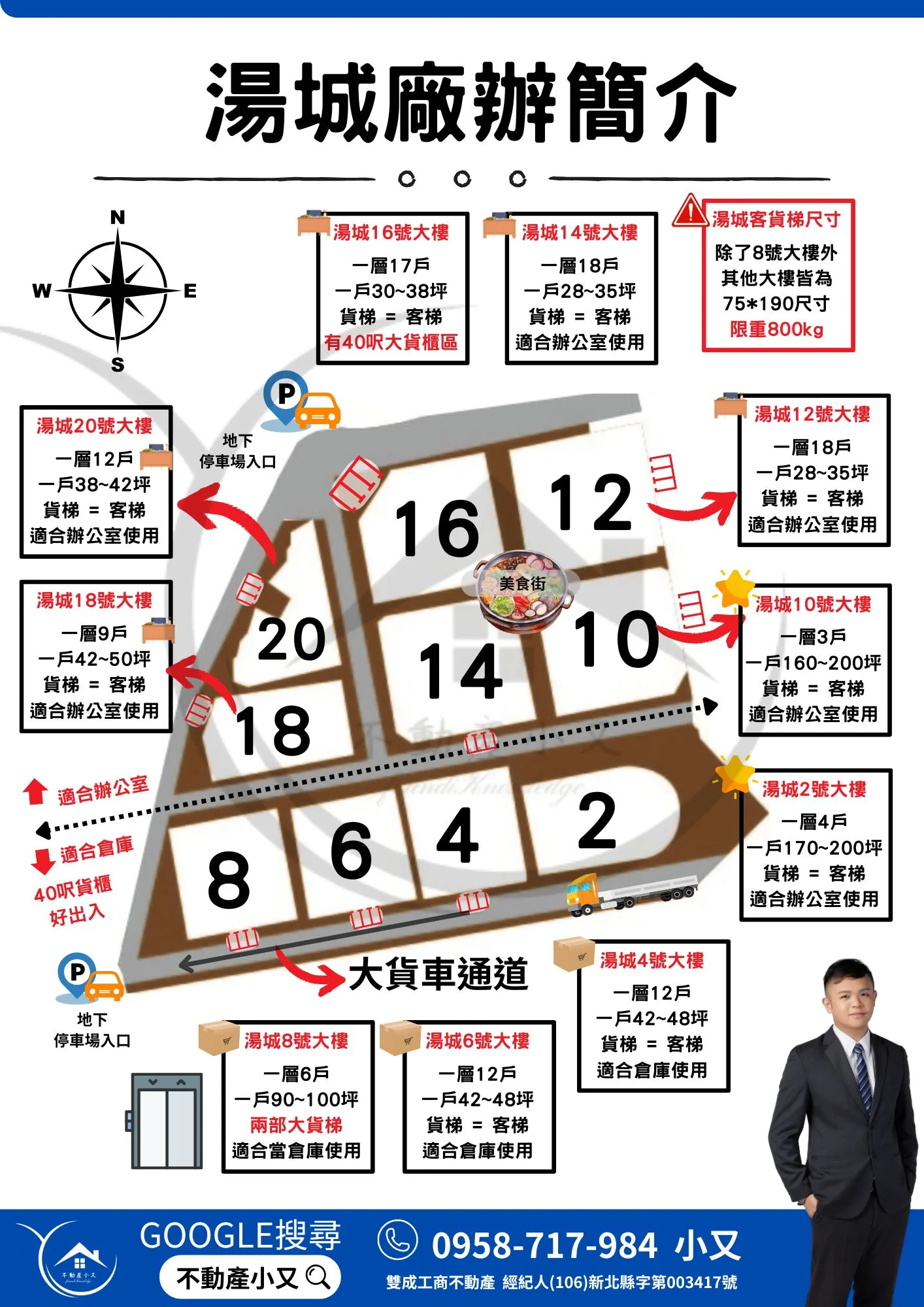 【三重廠辦】- 湯城園區12 2 月, 2025/0 評論/在: 所有文章/通過: ZeoYou 嗨!好久不見,今天小又來跟大家介紹三重最知名的廠辦園區 – 湯城園區 .湯城園區地理位置 湯城園區可以說是距離先嗇宮捷運站最近的廠辦,雖然地大物博,但是有好必有壞,下方跟大家介紹。 湯城園區平面圖 簡單來說..…湯城有幾個問題:第一、湯城有40呎貨櫃卸貨區的大樓只有 4 6 8 16號大樓其他棟只能下20呎貨櫃。第二、因為大貨車通道在2 4 6 8 這側,基本上2 4 6 8基本上屬性會以倉庫+辦公室為主,其他棟則以辦公室為主第三、湯城各棟大樓的戶數與坪數落差大,詳細如附圖,如果您有興趣歡迎加入我的 LINE官方帳號 了解內容!湯城廠辦優缺點 以上是小又這次帶來的湯城園區廠辦分享,若是您有廠辦的需求歡迎加入我的line官方帳號私訊我,之後小又還會繼續創作三重、上新莊廠辦的介紹,若是你想要看哪間廠辦的介紹也歡迎跟我說!期待與你的相遇。目前有的案件如下: http://www.wolung.com.tw/wp-content/uploads/2026/02/未命名設計.png 0 0 ZeoYou http://www.wolung.com.tw/wp-content/uploads/2026/02/未命名設計.png ZeoYou2025-02-12 04:57:532025-02-12 04:57:53【三重廠辦】- 湯城園區