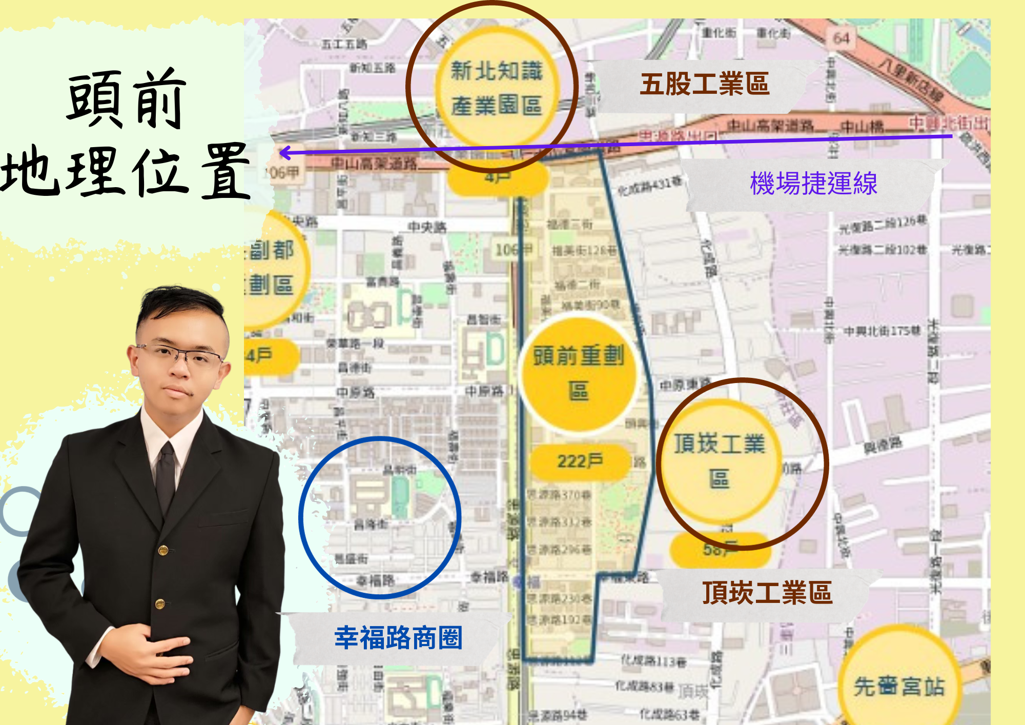 頭前區主要是東臨三重頂崁工業區的新莊早期的都市計畫,雖然重劃區範圍比較小,但是在整體開發是跟副都心重劃區有相同性質,屬於住商混和區域。