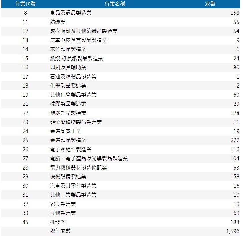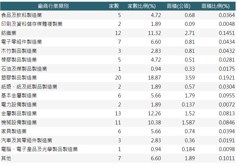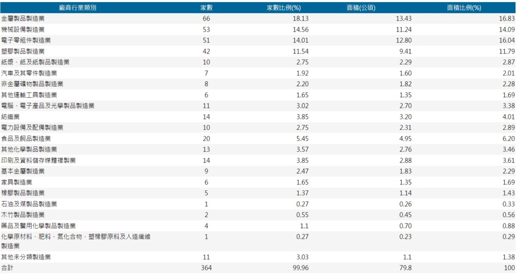 產業類別:塑膠製品製造業、金屬製品製造業及紡織業為前三大產業。
