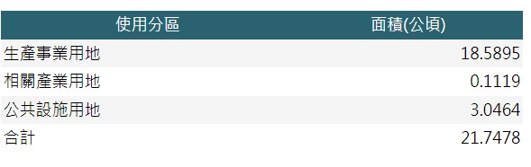 - 生產事業用地:185,895.13平方公尺(18.59公頃)