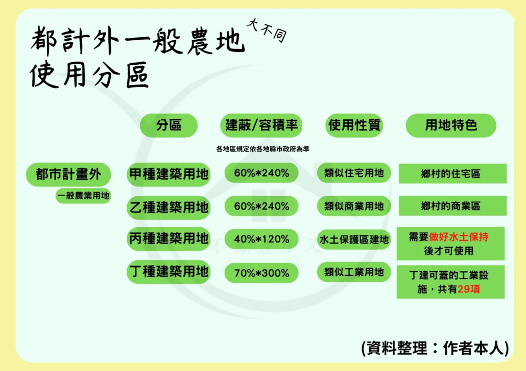 根據國土計畫法,未來會取消非<區域計畫法>,而區域計畫法是管理【非都市用土地】的法條,所以衝擊最大的正是我們的甲乙丙丁建!